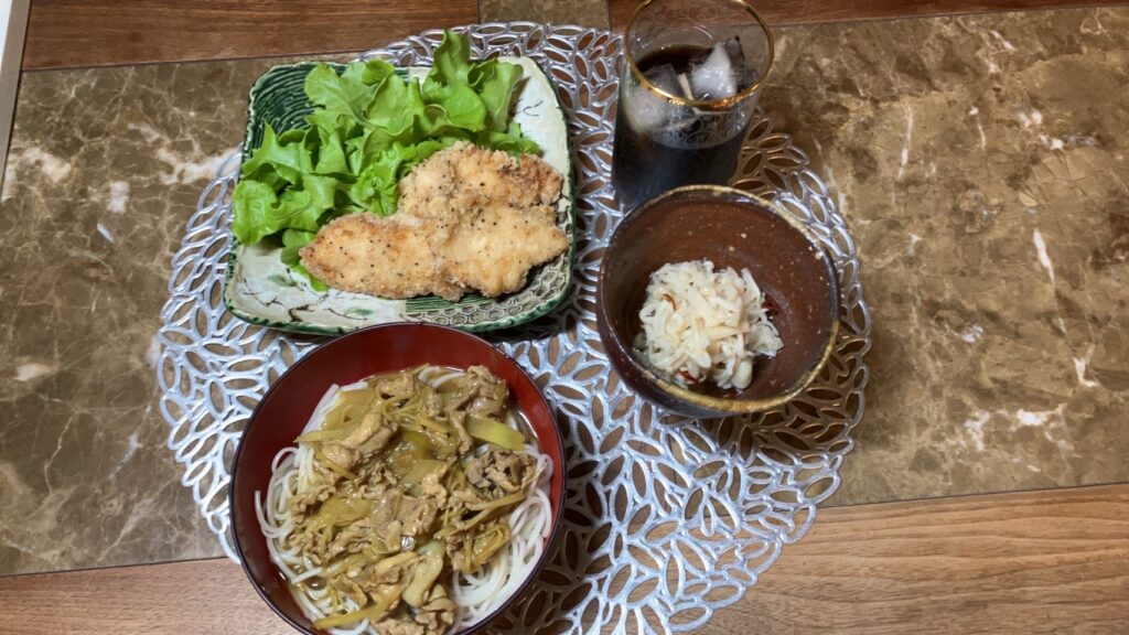 本日は、カレーうどん、鶏肉薄切りクイック唐揚げ、切り干し大根とエノキの甘酢漬け、アイスコーヒー 以上です。