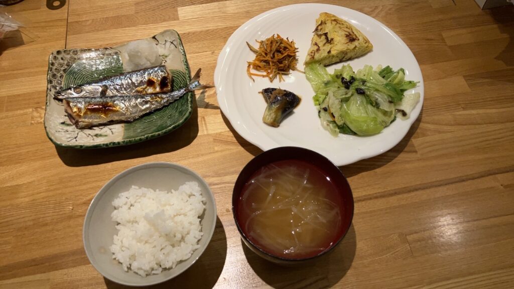 本日は 秋刀魚の塩焼き、キャベツのオムレツ、きんぴらごぼう、茄子の生姜焼き、レタスときゅうりのさらだ、大根の味噌汁、以上です。
