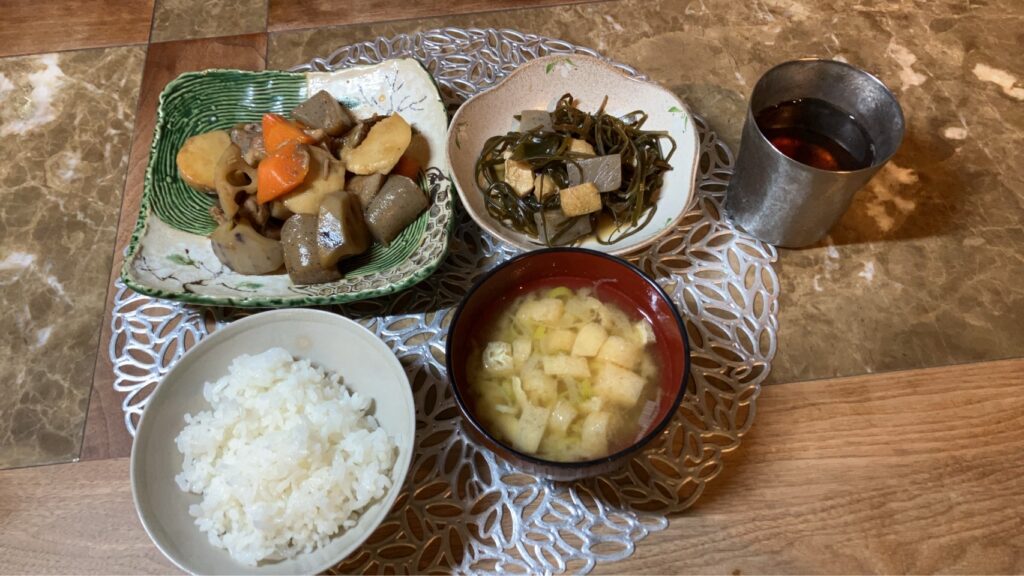 本日は、筑前煮、クーブイリーチ、ネギと油揚げの味噌汁、以上です。