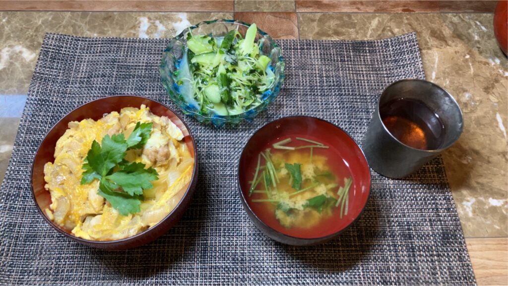 本日は、親子丼、和風グリーンサラダ、三つ葉の味噌汁、以上です。