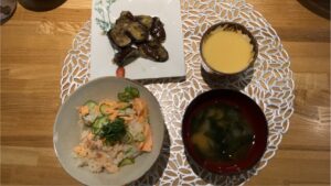 本日は、鮭ときゅうりのチラシ寿司、茄子の生姜炒め、茶碗蒸し、ワカメの味噌汁、以上です。