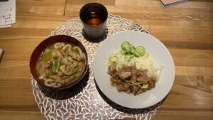 本日は、鶏のこがし醤油炒め、カレーうどん、サラダ、以上です。