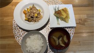 本日は、かぼちゃのグリル銀杏そぼろあん、キャベツのオムレツ、茄子の味噌汁、以上です。